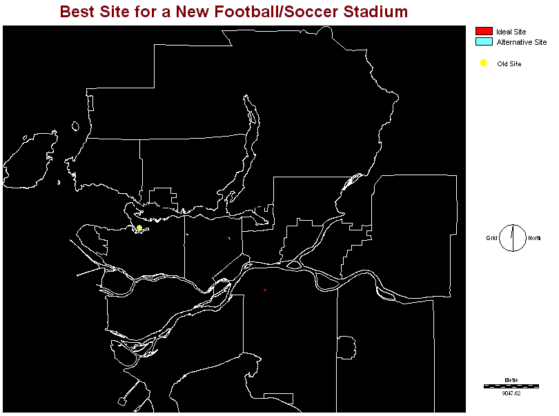 The final analysis left me with five potential sites. I then placed the city layers onto the map and noticed that one of the sites was on Annacis Island, while the other was near the CPR railway yard, so I eliminated those two, by using the ASSIGN module. I decided that if the Lions were to build a new stadium, it should be in Surrey. The City of Surrey has one of the fastest growing populations, and is expected to surpass that of Vancouver by 2010. Also, the new site location is right at the end of the skytrain line, King George Station, so it would be very accessible, by both skytrain and bus. The City of Surrey is also home to the Lion's practice facility.