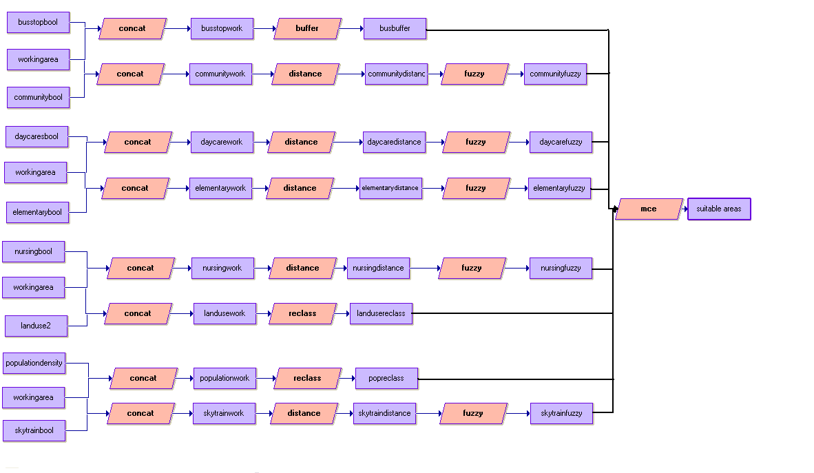 This is the cartographic model that I used to locate a suitable area for a new community centre in burnaby. This cartographic model helps me organize my thoughts about the order I am going to manipulate my data in. It shows all the modules I used on the different types of data and what the output of the modules are. The end results in the cartographic model is suitable areas accomplished by using a Multi Criteria Evalutaion.