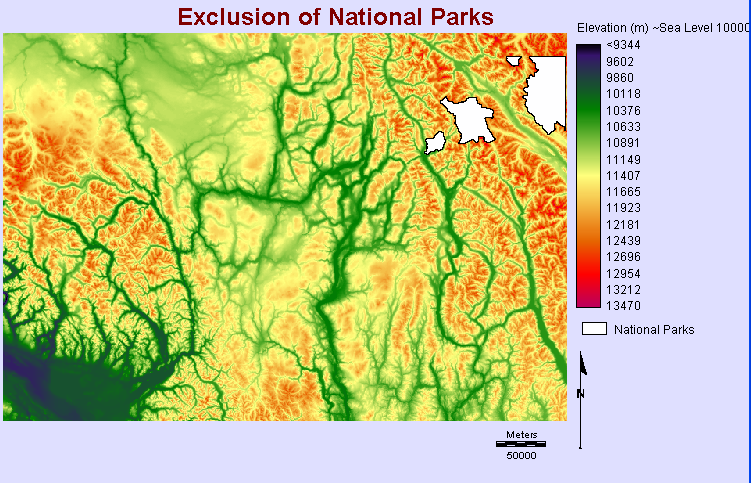National parks also aim to preserve the natural environment. Although there are only a couple of national parks adjacent to the Alberta border, they too are protected areas that have been eliminated from suitable land for the development of a ski resort. The module RECLASS was used to distinguish areas suitable surrounding national parks.