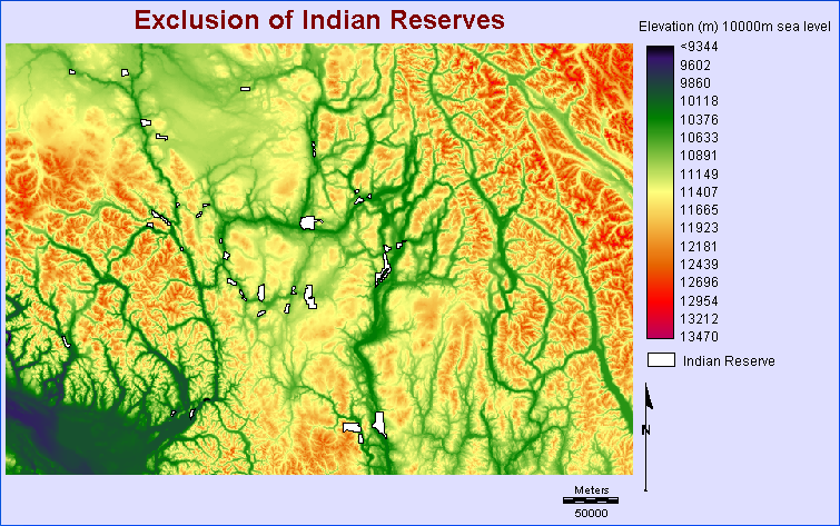Native reserves are areas where first nations people claim hereditary rights to the land. Although some first nations groups are open to explore business opportunities, all native reserves will be excluded from suitable area. Native reserves were then reclassified as unsuitable area by using the RECLASS module.