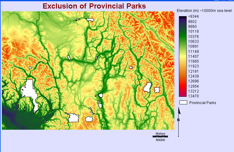 Provincial parks are scattered across southern B.C. Park management overlooks the preservation of the natural environment while also making it available for tourists to experience. These areas have been strictly eliminated from suitable land for a ski resort. The module RECLASS was used to reveal suitable area around provincial parks.