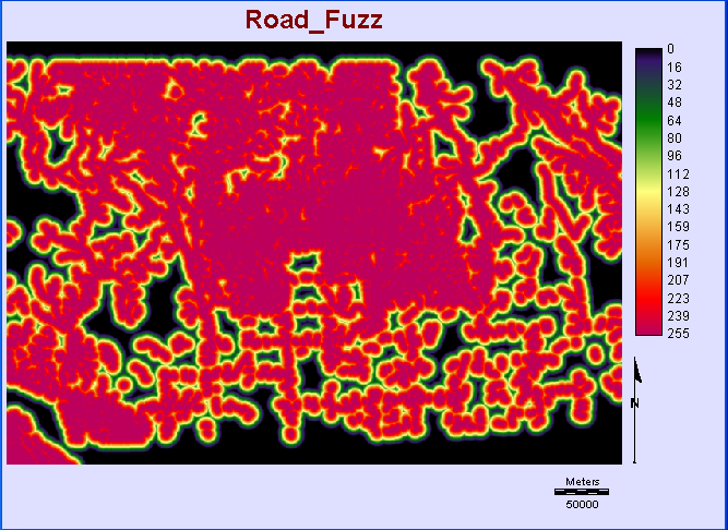 Close access to existing roads is a major benefit. For this reason, roads were assigned into one value using the RECLASS module and then measured using the DISTANCE module. Roads were then run through the FUZZY module where they were assigned sigmoidal monotonically decreasing curve. Road control points within 25,000m were suitable and the degrees of suitability would decrease with increased distance.