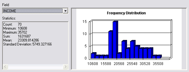 Then I opened the attributes table and viewed the statistics of the income attribute. From the Frequency Distribution I can see that the trend is moderate income: approximately above $16,000 and below $33,000. That just removes the really high and low incomes areas.