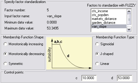 | slope_fuzz | 0.10 | Low slopes are most favourable, but it has a low weight because if there's no interest to farm in the area, the low slope plot has no purpose. An area with higher slope could possibly be landscaped way to accomondate a community farm (i.e. terrace) |