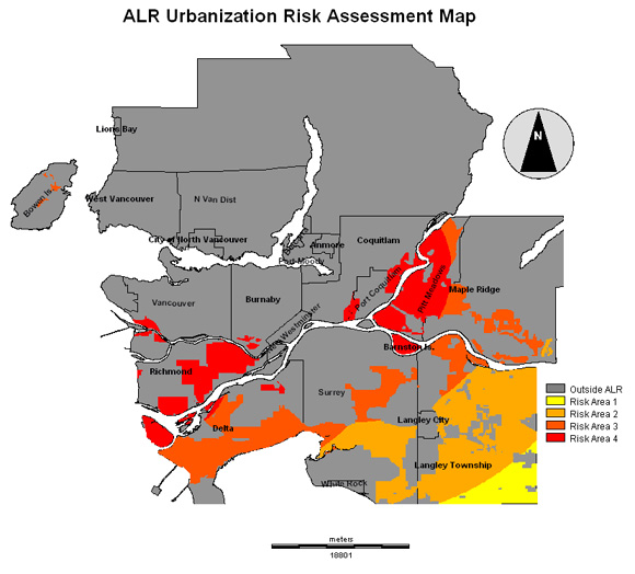 The following chart uses the information derived from the risk assessment analysis and shows that the ALR exists under different conditions within each municipality. This information shows which local governments are possibly dealing with the greatest level of urban and agricultural conflict, and consequently shouldering greater responsibilities to protect agricultural farmland at a provincial level in addition to satisfying local development goals.