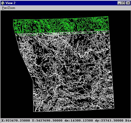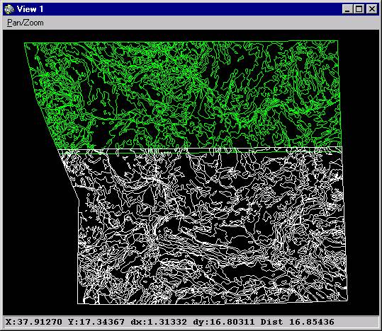 Altacoverage (in white) and the Jonbrencn2 (in green) coverages in untransformed digitizer units. Note the area of overlap showing the region to be clipped.