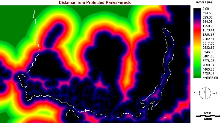 Next the Boolean images of protected watershed, open water bodies, and protected parks/forests (shown in section 3.4) must be converted into a distance image type. The distance images allows additional variables such as factors and constraints that aids in the production of final images for both my spatial analysis. The distance images also are used in the production of fuzzy images which will be discussed later.