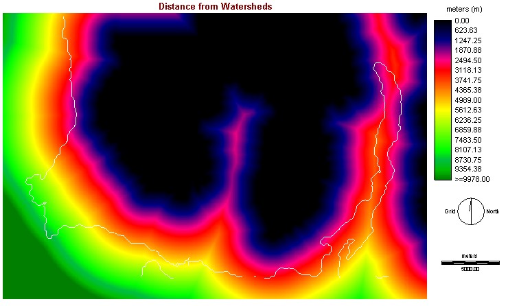 The following 3 distance images were created using the DISTANCE command in Idrisi: