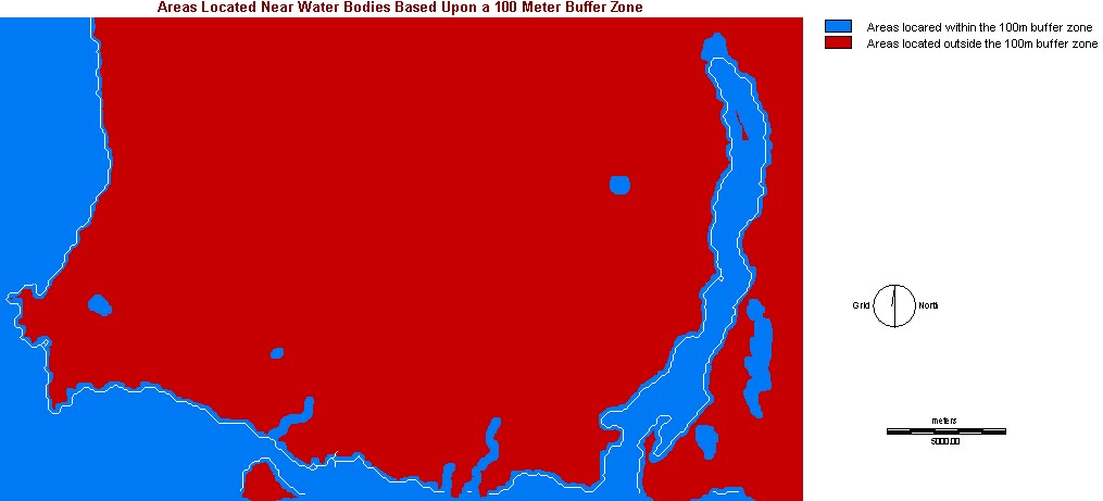 This involves the production of a raster image called WATERCON.rst. The image was created by reclassing areas from water to areas of land then placing a 50 meter buffer zone around all areas that contained water (lakes and open water in this case) using LANDUSE.rst as the image file. According to the image below, areas indicated in red show areas to be considered for urban development based upon a 50 meter buffer zone placed around water bodies, those indicated in blue are not to be considered at all.