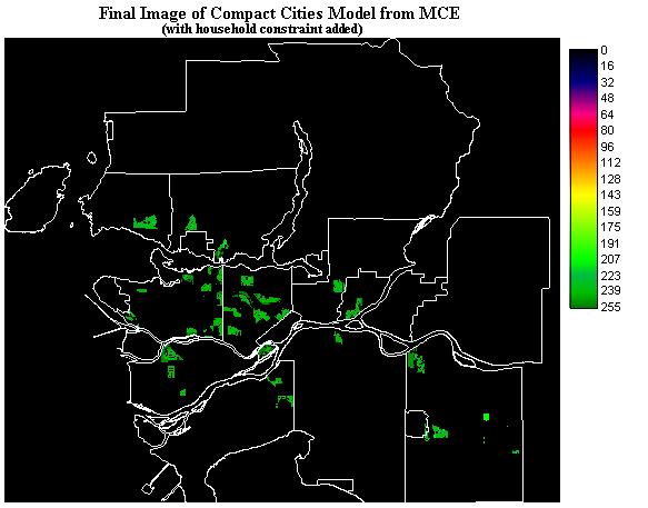 The results of WLC are 2 suitability maps -- one for each scenario. These maps indicate the relative suitability (0 = least suitable & 255 = most suitable) of the areas in GVRD for future developments. Notice that a lot of the areas are masked out (i.e. have a value of 0) because of the constraints that are applied.
