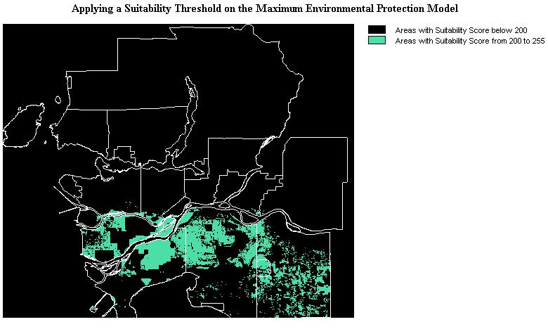 There are two basic methods for site selection using a continuous image of suitability: Specifying a suitability threshold and total area threshold. Applying either type of thresholds will result in a Boolean map indicating the selected sites.