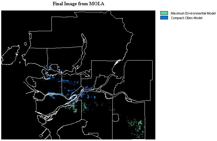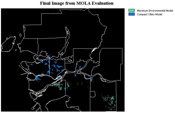 Next, I run the MOLA module to find out a compromise solution that is best for the overall situation -- I specify an equal weight of 0.5 for the 2 objectives, an area requirement of 6000 pixels for the 1st objective (1500 hectares) and 12000 pixels for the 2nd objective (3000 hectares), and a 100 pixel tolerance.