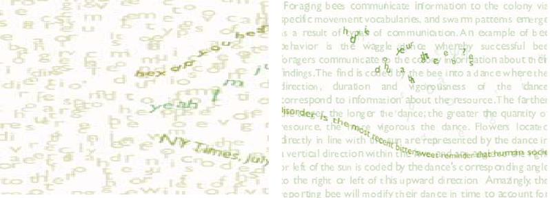 HIVE system clusters the texts into swarming visualizations and sonic reponses, representing