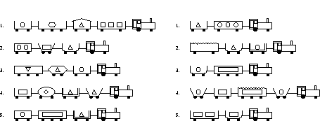 The Michalski train problem was invented by Ryszard Michalski around 20 years ago. It is simply stated - find a concept which explains why the five trains on the left are travelling eastbound and the ones on the right are travelling westbound. The solution must involve the concepts on view: size, number, position, contents of carriages, etc. It is left as an exercise to find the solution... This is a standard problem which has been used to test and demonstrate many machine learning techniques. In particular, Inductive Logic Programming implementations (which we discuss later) use this example for demonstrative purposes. |