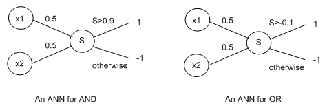 Note that the w, x, y and z represent real valued weights and that all the edges in this graph have weights associated with them (but it was difficult to draw them all on). Note also that more complicated ANNs are certainly possible. In particular, many ANNs have multiple hidden layers, with the output from one hidden layer forming the input to another hidden layer. Also, ANNs with no hidden layer - where the input units are connected directly to the output units - are possible. These tend to be too simple to use for real world learning problems, but they are useful to study for illustrative purposes, and we look at the simplest kind of neural networks, perceptrons, in the next section.