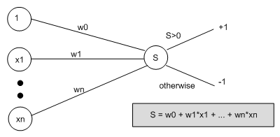 Then, we say that the output from the perceptron is +1 if the weighted sum from all the input units (including the special one) is greater than zero, and it outputs -1 otherwise. We see that weight w0 is simply the threshold value. However, thinking of the network like this means we can train w0 in the same way as we train all the other weights.