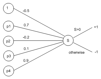 Suppose we are trying to learn a perceptron to represent the brightness rules above, in such a way that if it outputs a 1, the image is categorised as bright, and if it outputs a -1, the image is categorised as dark. Remember that we said a 2x2 black and white pixel image is categorised as bright if it has two or more white pixels in it. We shall call the pixels p1 to p4, with the numbers going from left to right, top to bottom in the 2x2 image. A black pixel will produce an input of -1 to the network, and a white pixel will give an input of +1.