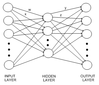In our vehicle example, it is likely that the images will all be normalised to having the same number of pixels. Then there may be an input unit for each red, green and blue intensity for each pixel. Alternatively, greyscale images may be used, in which case there needs only to be an input node for each pixel, which takes in the brightness of the pixel. The hidden layer is likely to contain far fewer units (probably between 3 and 10) than the number of input units. The output layer will contain three units, one for each of the categories possible (car, bus, tank). Then, when the pixel data for an image is given as the initial values for the input units, this information will propagate through the network and the three output units will each produce a real value. The output unit which produces the highest value is taken as the categorisation for the input image.