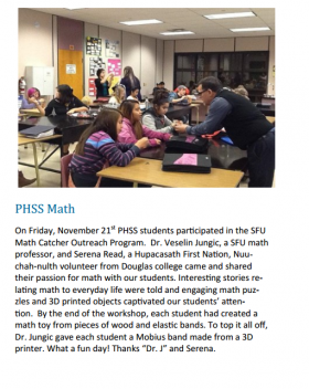 Math Catchers visited Port Hardy Secondary School where we met with about 90 Grade 8 students. Our host was Mrs. Stacia Johnson, a Languages, DL and Learning Improvement Teacher.