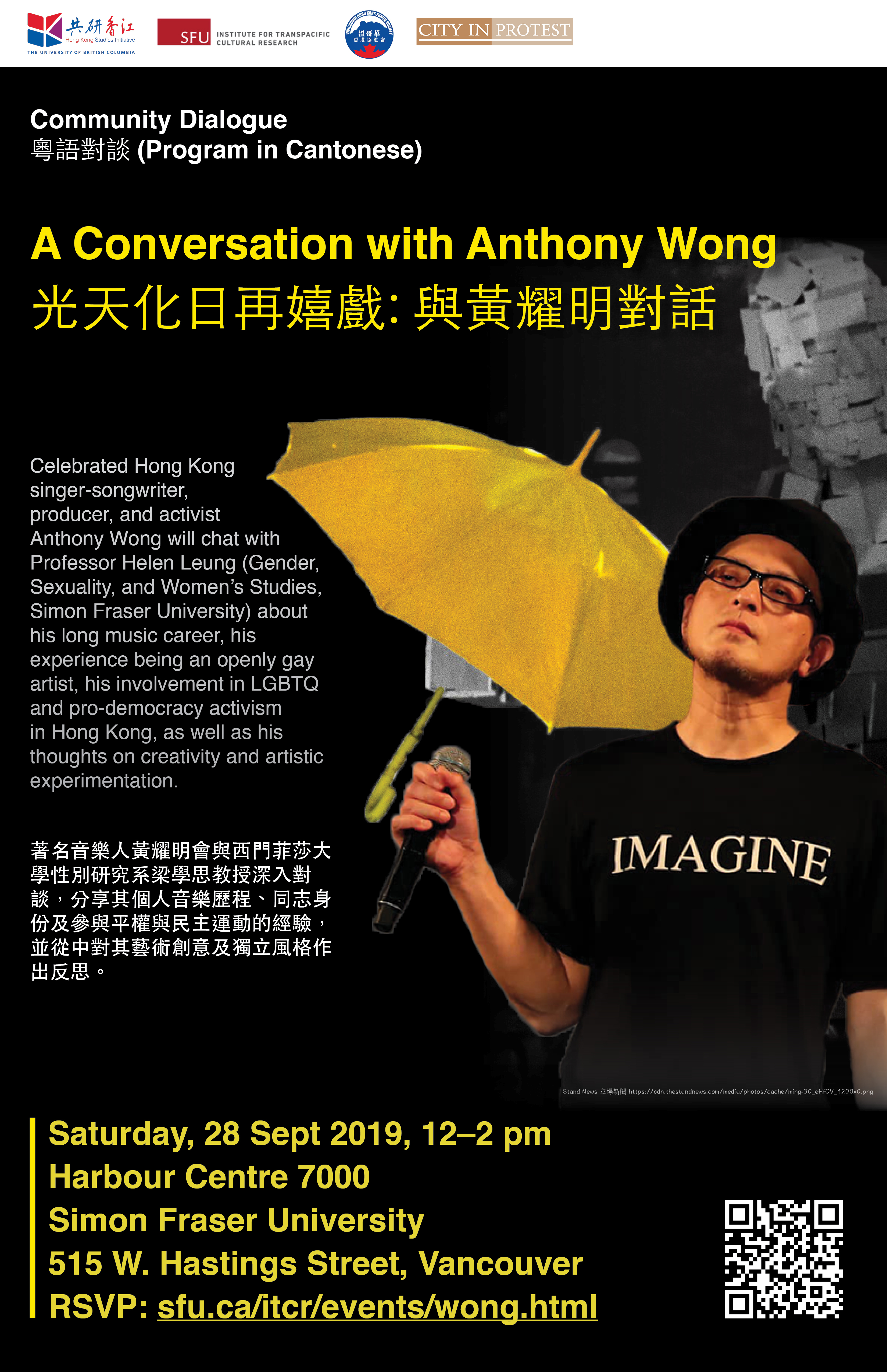Celebrated Hong Kong singer-songwriter, producer, and activist Anthony Wong will chat with Professor Helen Leung (Gender, Sexuality, and Women’s Studies, Simon Fraser University) about his long music career, his experience being an openly gay artist, his involvement in LGBTQ and pro-democracy activism in Hong Kong, as well as his thoughts on creativity and artistic experimentation.