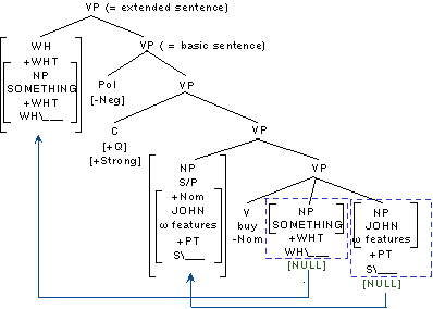 (6) [VP [+WH] <[VP [-Neg] <[VP [C +Q] <[VP BUY <SOMETHING+WHT> <JOHN+PT>]>]>]>].