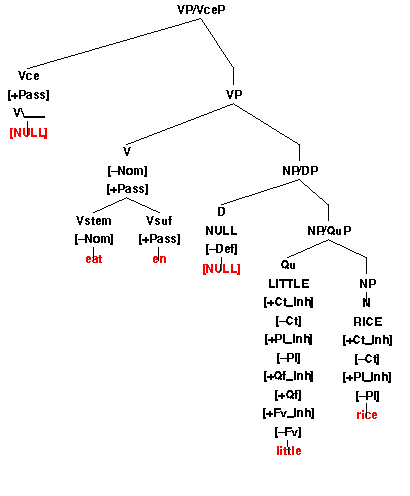Note that the nil plural feature becomes plus. This happens through agreement when Qu governs NP and N. This is a process and is marked in red above. In the underspecified hypothesis, structure expansion of feature agreement is a process each time a sentence is uttered.