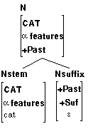 Now if the firs diagram is in some sense true, and the second one is derived from it, it stands to reason that they are linked in the lexicon; i.e. the underspecified one feeds the specified one. To put it in another way, CAT does not occur twice in the lexicon, but once. The information listed in the underspecified entry is hard wired to the fully specified entry, thus requiring one bundle of memory cells. Only the feature listed in red is not hard wired to the underspecified entry.
