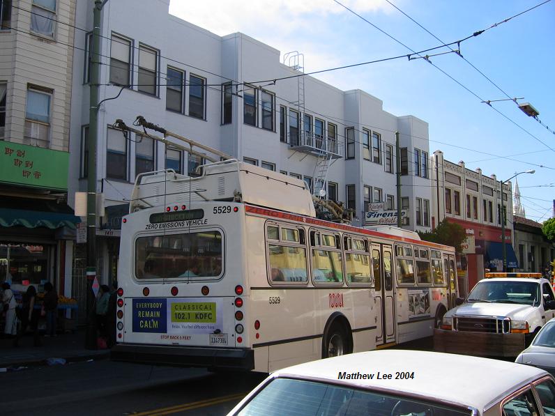 ETI 5529 moving around obstruction on Stockton St. between Valejo and Green Sts. with its poles down on battery mode. Photo be Matt Lee. 1 JN 2004.