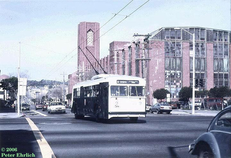 TC 50 northbound on Arguello crossing Geary St. Photo by Peter Ehrlich. 6 FE 1988.