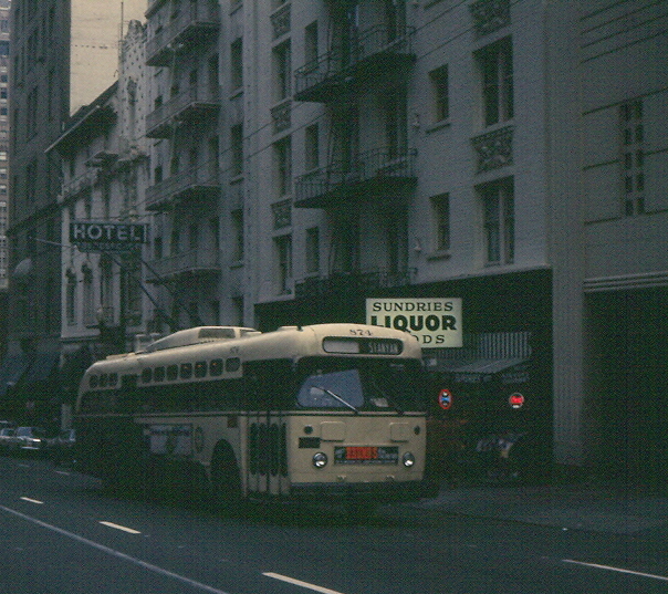 St. Louis 874 on an unidentified street in downtown San Francisco on a fan trip. Photo by Cameron Beach. 5 DE 1970.