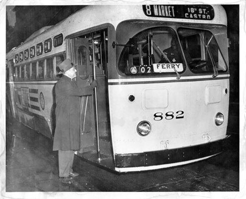 St. Louis 882 outbound on route 8 to the Castro District. The trolley is a year old here. Photographer unknown. 1952.