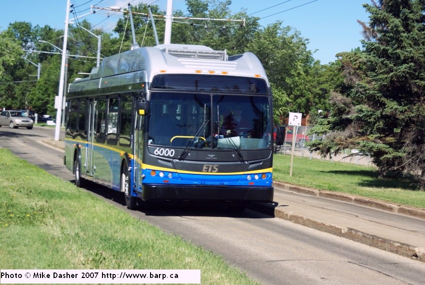 NFI LFR 6000 on test in Edmonton. The coach is on loan from Vancouver (21xx). The location appears to be on route 5. Photo by Mike Dasher. AU 2007.