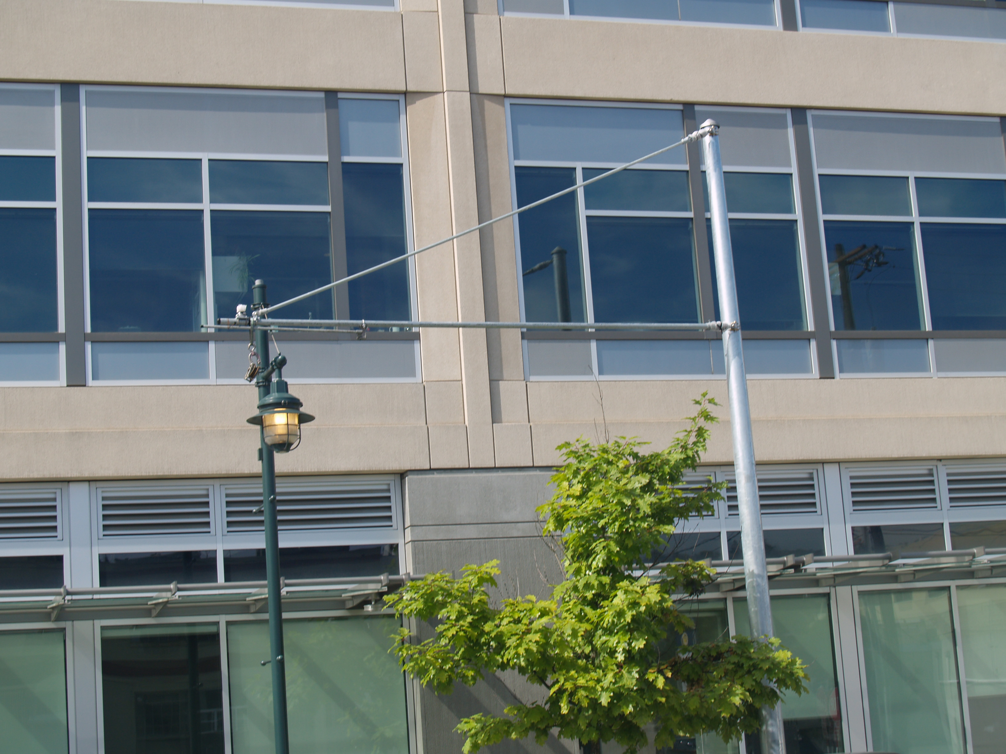 Traction pole and bracket arm for the streetcar overhead.The bracket arm will be turned 90 degrees for installation. Photo by R. C. DeArmond. 7 SE 2007.