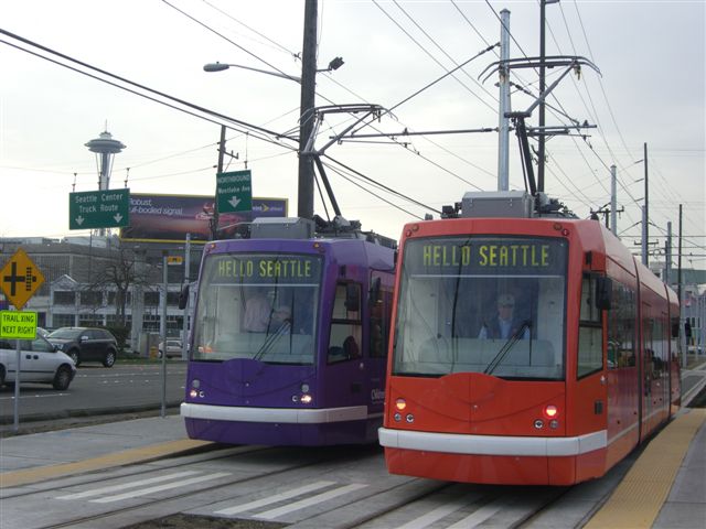 Seattle's new street line went into service yesterday at 12:15 p.m. The streetcar photo here is of the Orange car. There are three streetcars: Orange, Red and Purple. The line is 1.3 miles long and cost $52 million. The streetcar operates from 6 a.m. until 9 p.m. Monday to Thursday, until 11 p.m., Fridays and Saturdays and from 10 a.m., and from 10 a.m. on Sundays. The street car crosses trolley route 70 at Stewart and Westlake, Virginia and Westlake, Harrison and Fairview (the spur to the garage), N. Fairview Ave. and Valley St. Photographer unknown. 12 DE 2007. Courtesy of the Seattle Times.