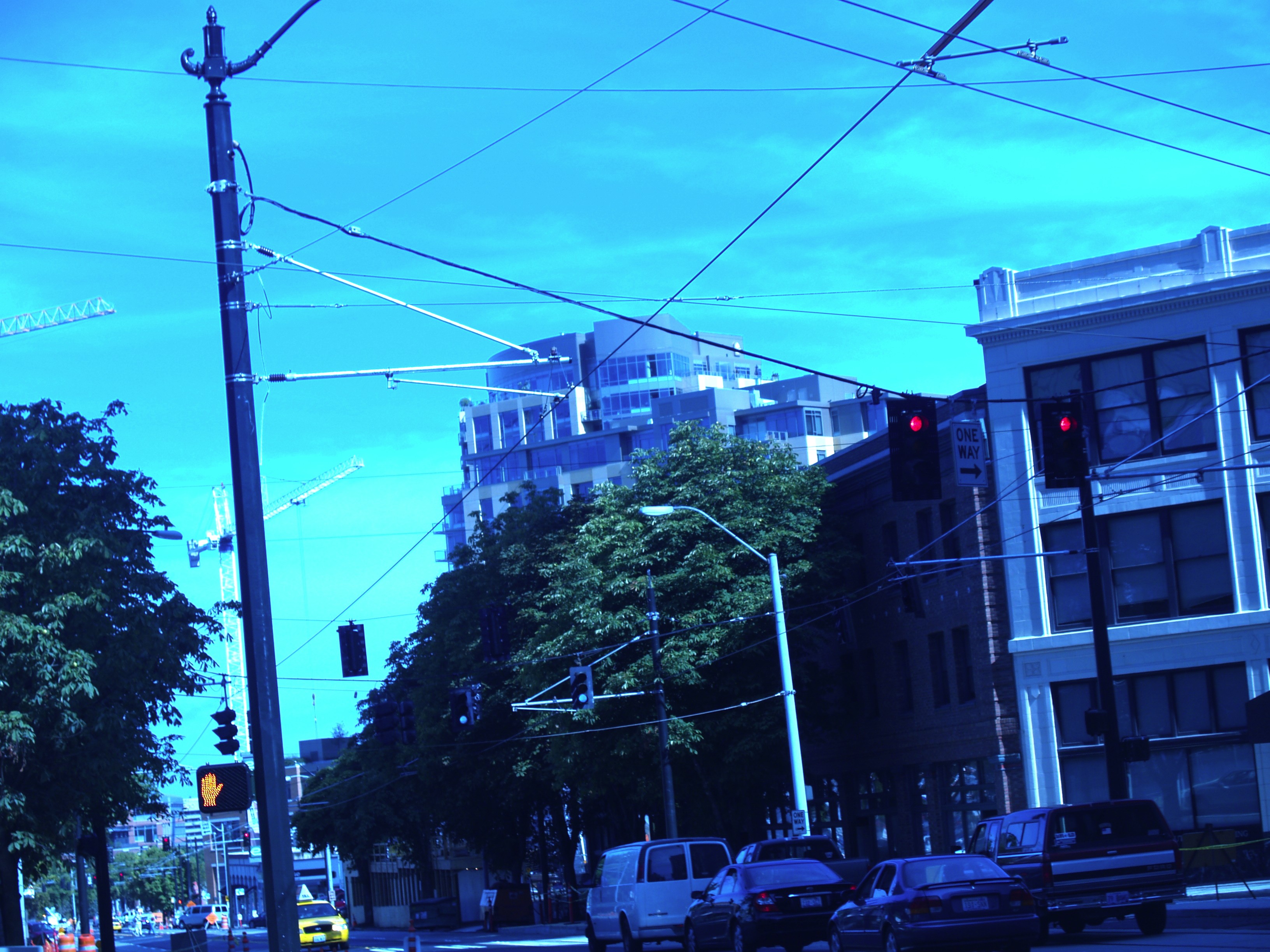 The southbound streetcar trolley wire crosses over the trolley wires for route 70 at Westlake Ave and Stewart St. Photo by R. C. DeArmond. 7 SE 2007.