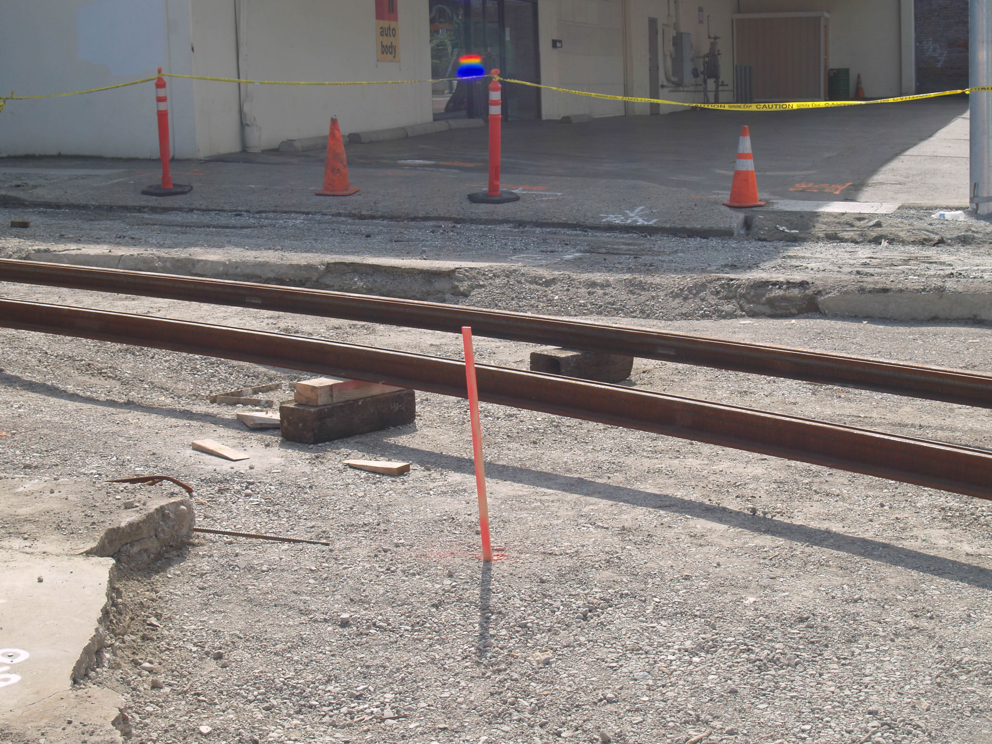 Tracks suspended on bricks plus an unknown object on Henderson St. just east of Terry St. They are waiting for ties and other items for permanent placement. Photo by R. C. DeArmond. 7 SE 2007.
