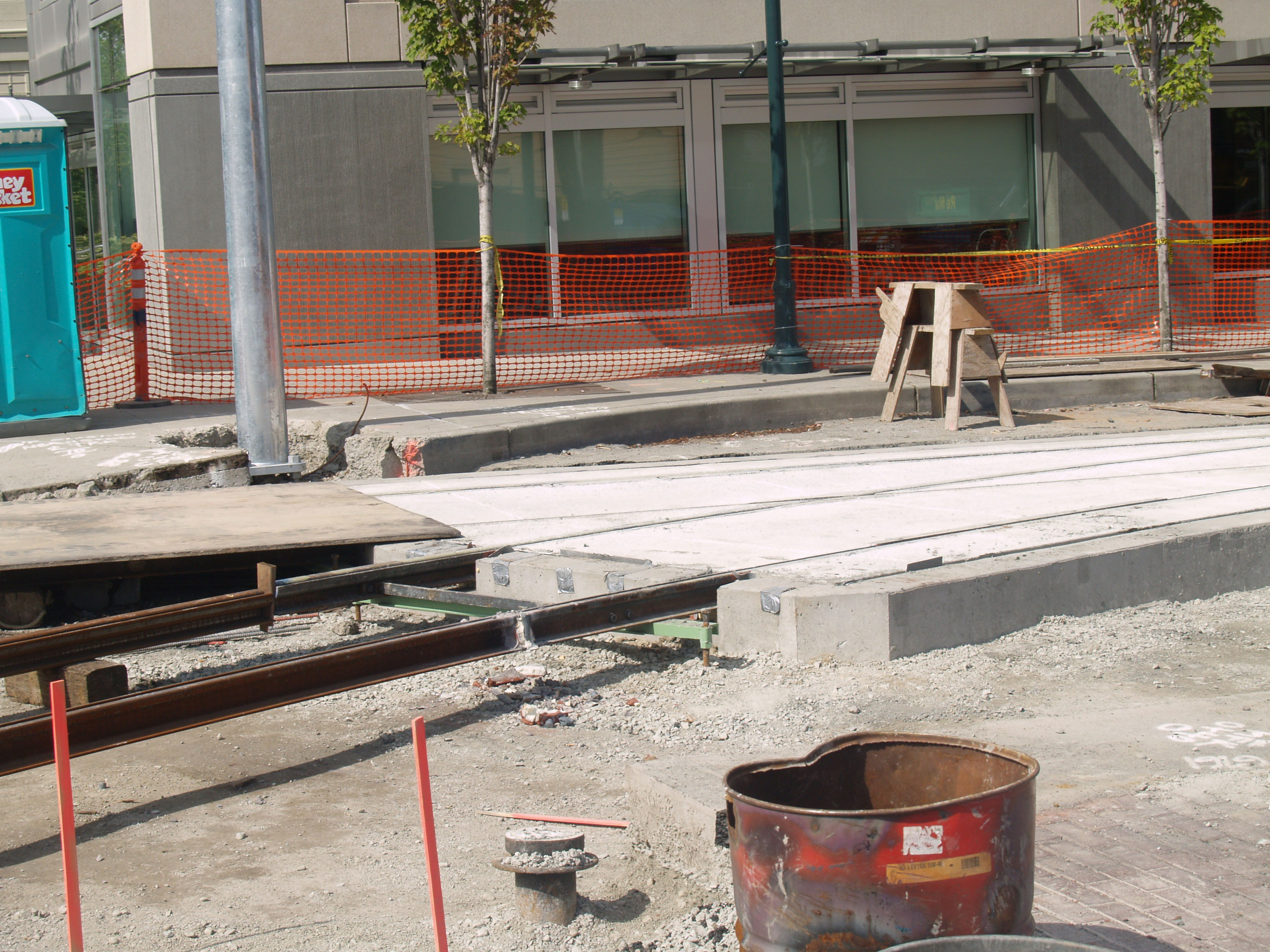 Rail installation on the spur that connects the northbound streetcar rails on E. Harrison St. Photo by R. C. DeArmond. 7 SE 2007.