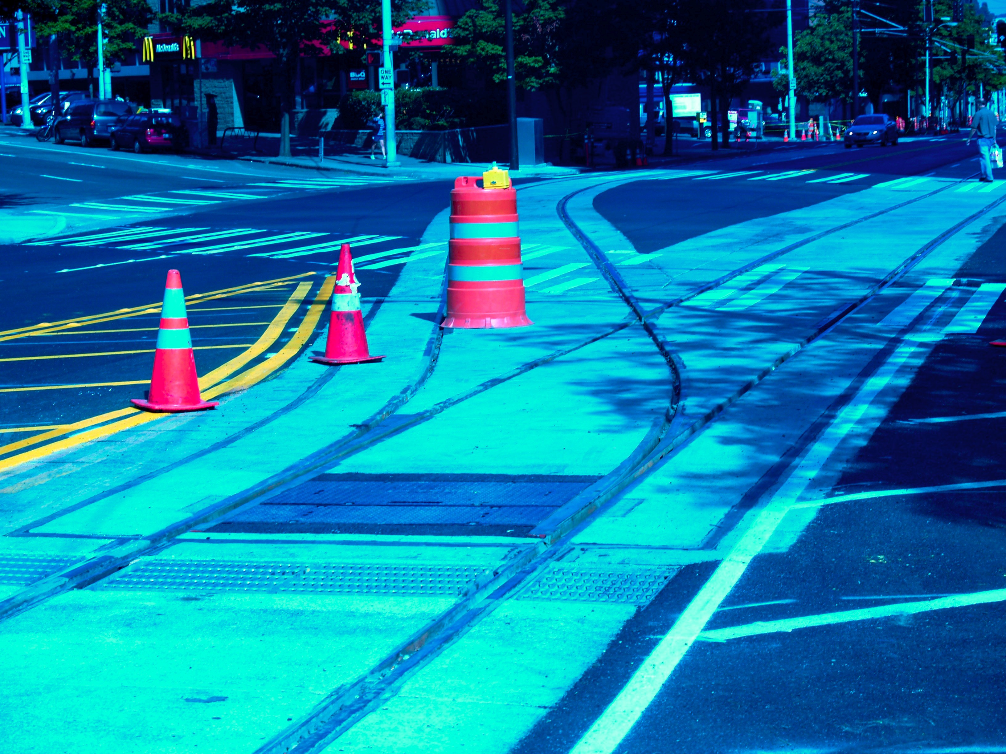 Tracks coming together at the southern terminus of the streetcar line at 5th Ave. and Olive Way. Photo by R. C. DeArmond. 7 SE 2007.