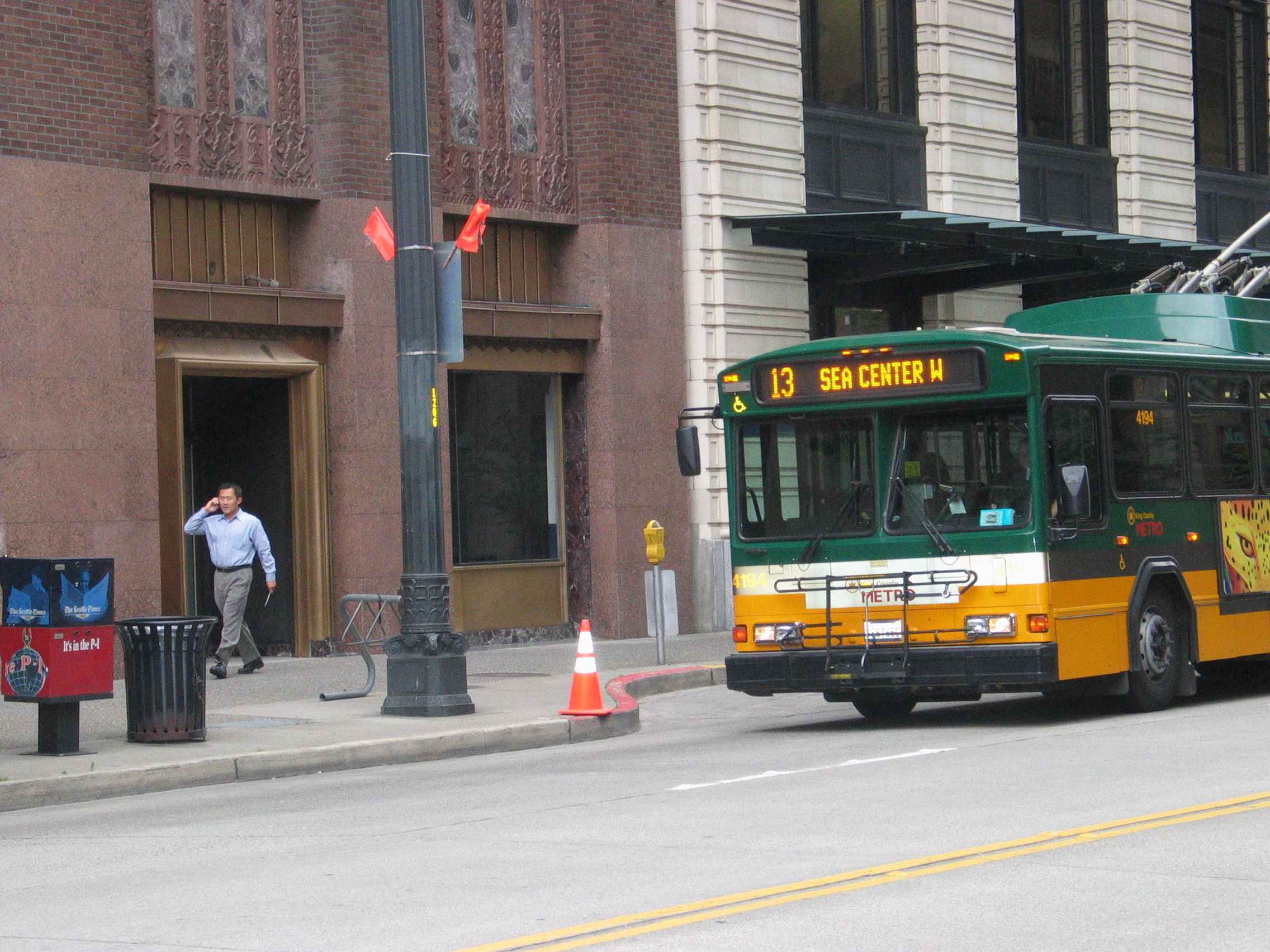 Gillig 4194 on 3rd Avenue on route 13 heading towards its terminus at W. Cremona St. and 3rd Ave. W. The destination sign says "Seattle Center W". Initially, the buses and trolleys displayed a split sign: the route number and destination were on the left side. The right side was often blank if there were no branch lines or it indicated the destination if there were two branches or a short turn loop. Go to Seattle Photos 12 on the photo album page also given at the bottom of Seattle Photos 14 for some pictures of this on the historical vehicles. The AMGs entered service with the new system in 1979. Since January 1978, the destination sign showed the terminus and a "via" sign indicating the main route or area the bus would go along. Some of the destination signs on the Gilligs now omit the wording "via". So this one, for example, displays "Seattle Center W" alternating with "SPC". Long time residents are probably taking this in their stride but it must be confusing the tourists and out-of-towners. Photo by R. C. DeArmond. 8 JN 06.