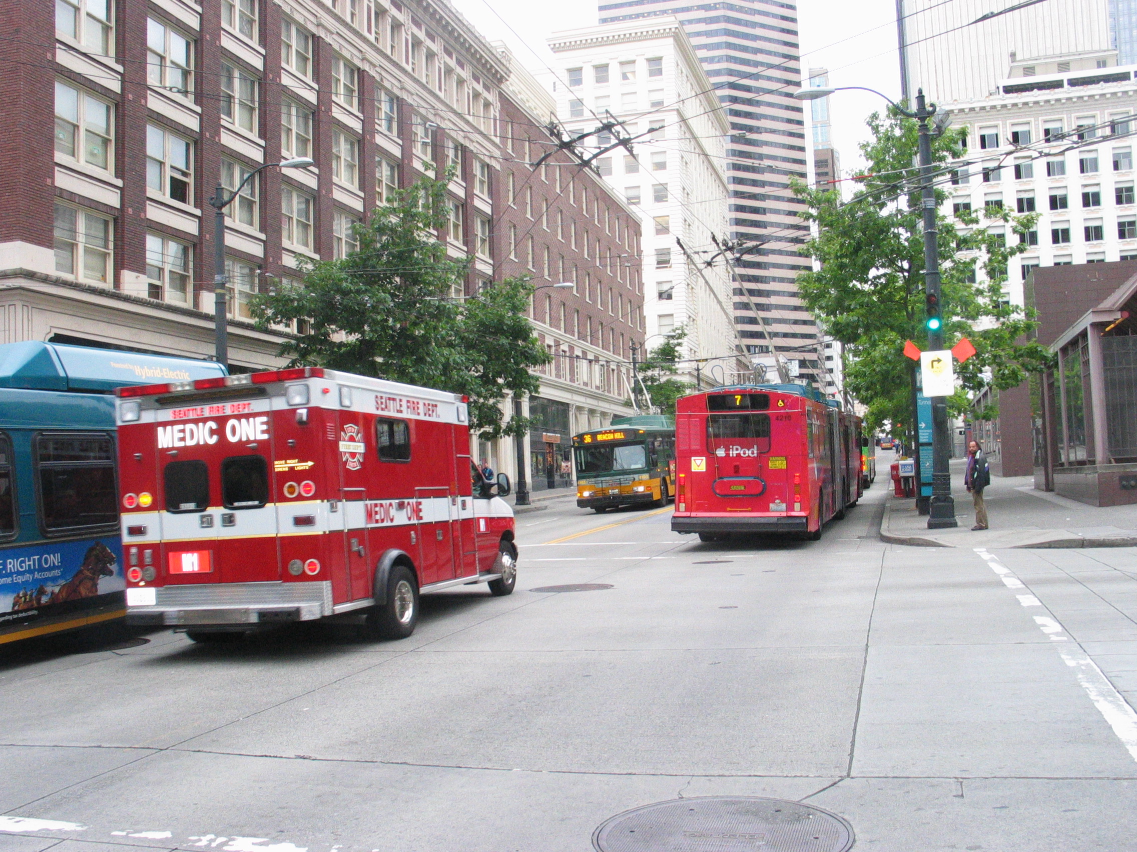 Breda 4210 on 3rd Ave. at Jefferson St. heading north to its terminus at 7th Ave. and Virginia St. It is following an unidentified trolley and passing another unidentified trolley on route 36 heading for its terminus at S. Othello St. and Beacon Way S. Photo by R. C. DeArmond. 8 JN 06.