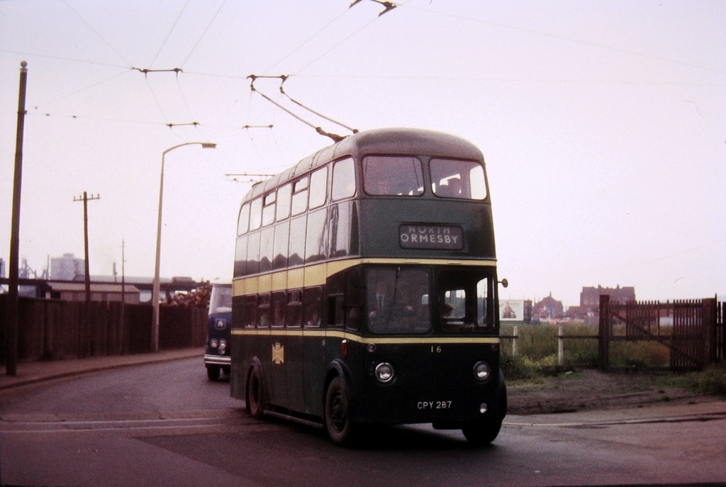 #16 en route to North Ormesby, run by Tees-side Railless Traction. Photo by Geoffery Tribe. JL 1968.