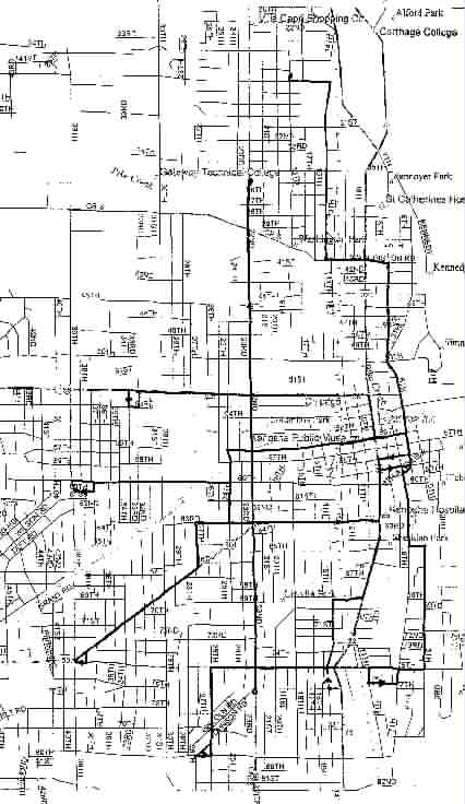 It is difficult to identify the routes, except for the Orange Line, which is the crosstown route on 27th Ave., formerly called Howland Ave. At some time since the early trolleybus period, the streets were given numbered names. The Green Line was formerly the Elizabeth - North Main streetcar line. It is very possible that 6th Ave. replaced Main St. But it is impossible to tell which street was Elizabeth. Similarly, the Red and Blue lines cannot be identified on the map.
