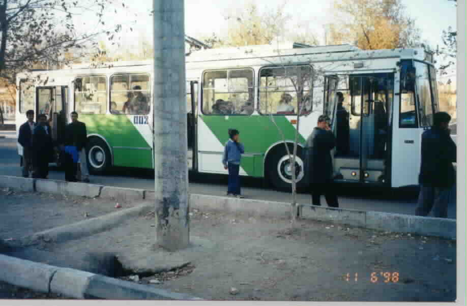 on the front of the bus reads " Urganch", which I believe