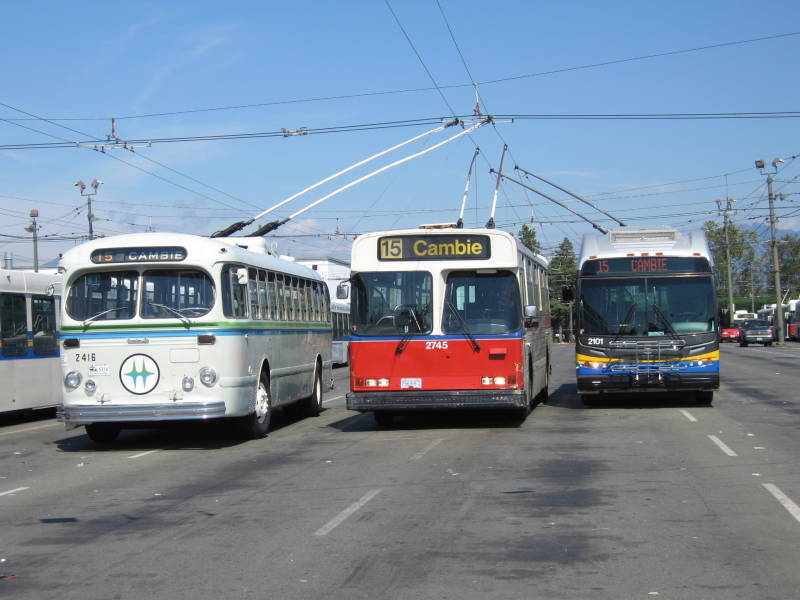 Three generations of Vancouver trolleybuses: Brill 2416, preserved; Flyer E800