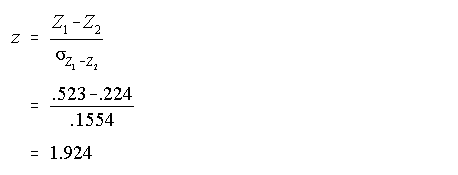 This question wants a two-tailed test. The first step (after deciding whether it is a one- or two-tailed test and determining what the critical value is) is to use Table 5 (Fisher's r to Z) to transform the two Pearson's r values into Fisher's Z values. Note that these will not be z-scores! Table 5 gives Z = .224 for r = .22 and for r=.48, it gives Z = .523. It is the difference between .523 and .224 that are used in the actual test.