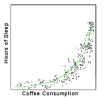It appears to be the case that the relationship between coffee consumption and hours of sleep is not linear. A straight line is not a good description of the data. A curved one, like the green one drawn on the scatterplot, does a much better job of summarizing the relationship in the data.