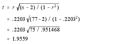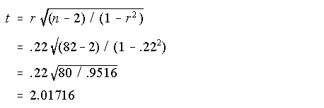 Because the obtained value of t alternate is between 1.990 and 2.374, the probability of getting a t this large is between .05 and .02, or between 5% and 2%. This is also the probability of getting a correlation as large as .22 (or -.22) in a sample drawn from a population in which the correlation is zero.