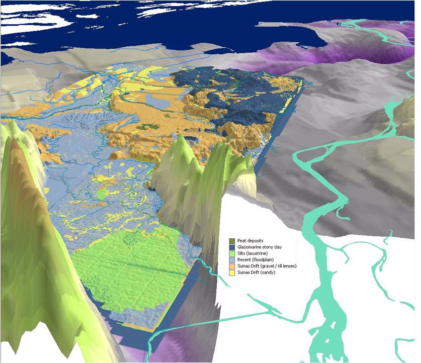 | The Abbotsford-Sumas aquifer is confined by bedrock outcrops at Sumas and Vedder Mountains along the Sumas Valley and hills to the south of Nooksack River near Bellingham. The bedrock surface is buried beneath thick Pleistocene sediment fill that masks most of the bedrock topography. The elevation of the bedrock surface beneath the Pleistocene deposits of the lowland varies considerably, indicating pre-glacial erosional topography with large relief. Near Abbotsford, there is about 300 to 500m of Pleistocene sediment, which thins out near Sumas Mountain. A digital bedrock topography map has been generated using deep borehole data, existing bedrock contour maps, valley wall profiles, and extrapolated cross-sections through the study area. |