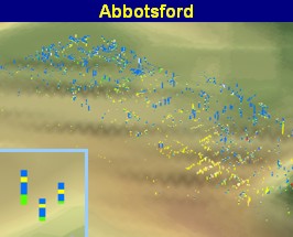 The glacial sediments are very complex in the Fraser Lowland. The lithostratigraphic units are approximately equivalent to the chronostratigraphic units as described in the Quaternary history of the area. Sumas Drift forms the unconfined Abbotsford-Sumas Aquifer. Sumas Drift consists of diamictons (lodgement and flow tills), thick and well-sorted glaciofluvial outwash sands and gravels (advance and recessional), glaciolacustrine sediments, and ice-contact sediments deposited during the Sumas Stade. It also contains lenses of till. The construction of cross-sections through the aquifer has proven to be a difficult task as layers are not easily identifiable. Shown to the left are colour coded well logs across Abbotsford. |