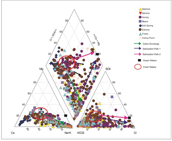 The groundwater chemical evolution was previously described for Saturna Island by Allen and Suchy (2001). This study has combined all the groundwater chemistry data for the Gulf Islands and confirmed a similar overall chemical composition for the other Gulf Islands.
